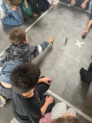 Die Vorschulkinder lernen in kleinen Teams mit Hilfe der zukünftigen Paten unsere Schule kennen. Sie würfeln, suchen Zahlen, benennen Bilder, zählen, hüpfen, und haben Spaß bei noch allerlei mehr kleinen Aufgaben. (Chaosspiel)